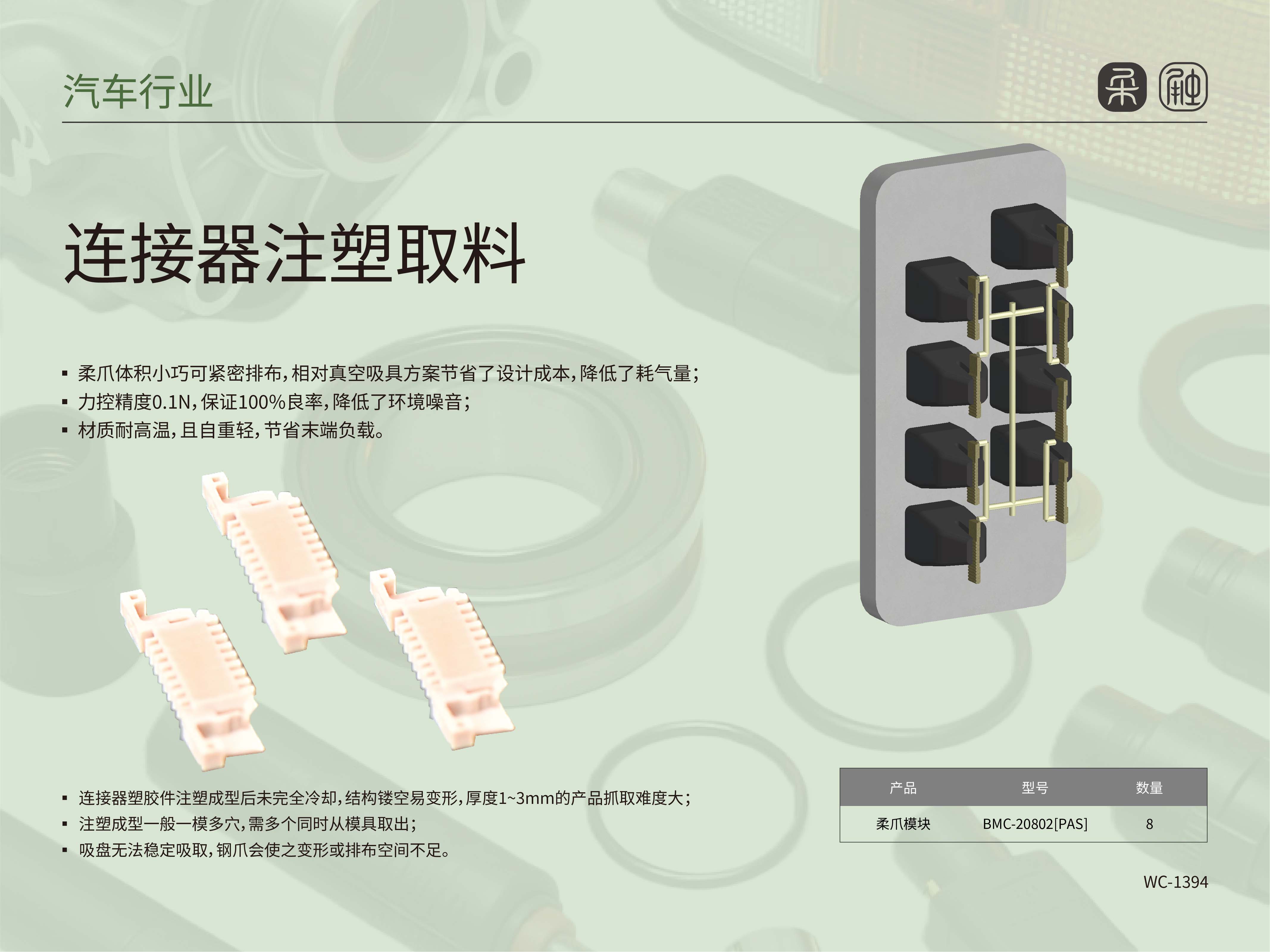 连接器塑胶件注塑成型后未完全冷却,结构镂空易形变,厚度1-3mm的产品抓取难度大;