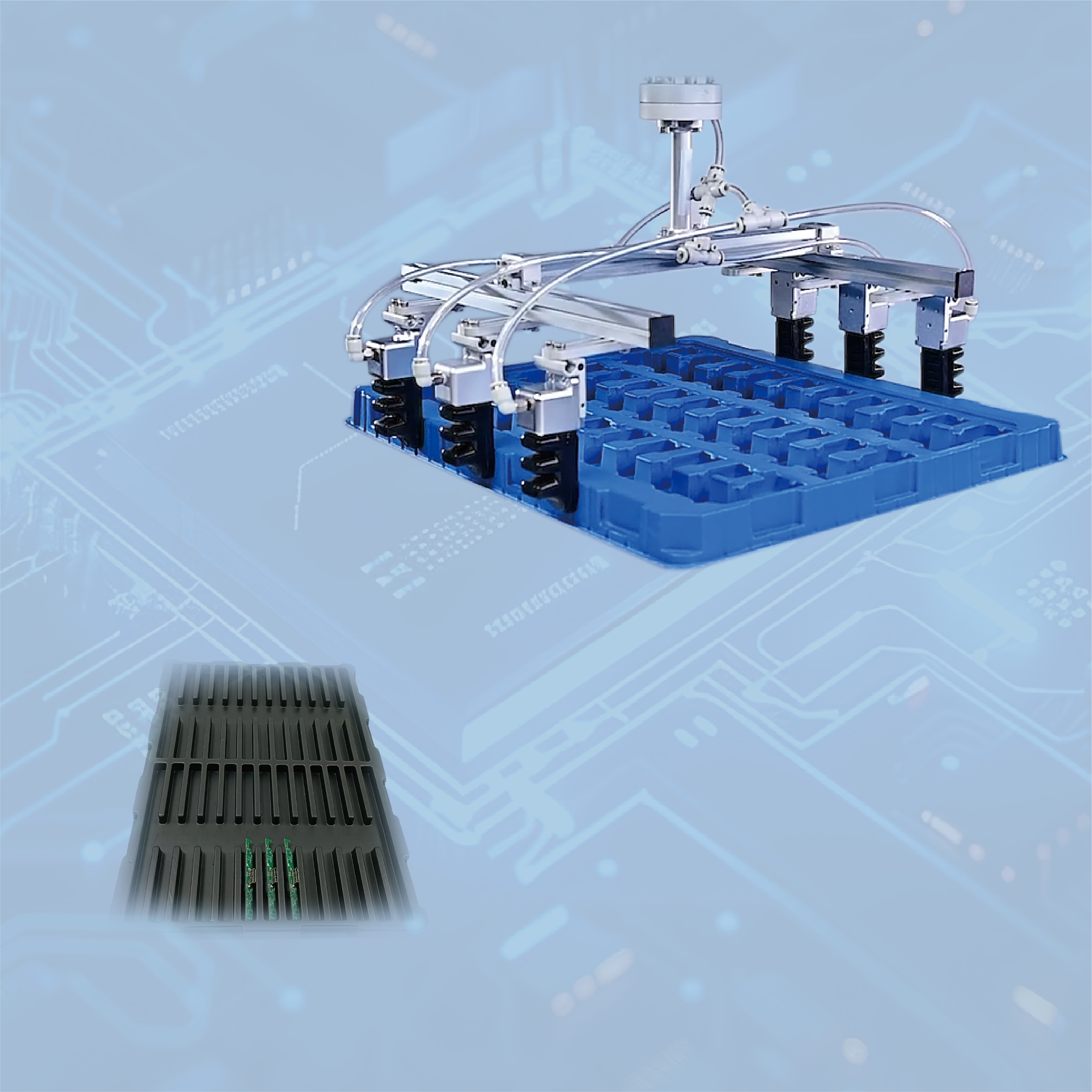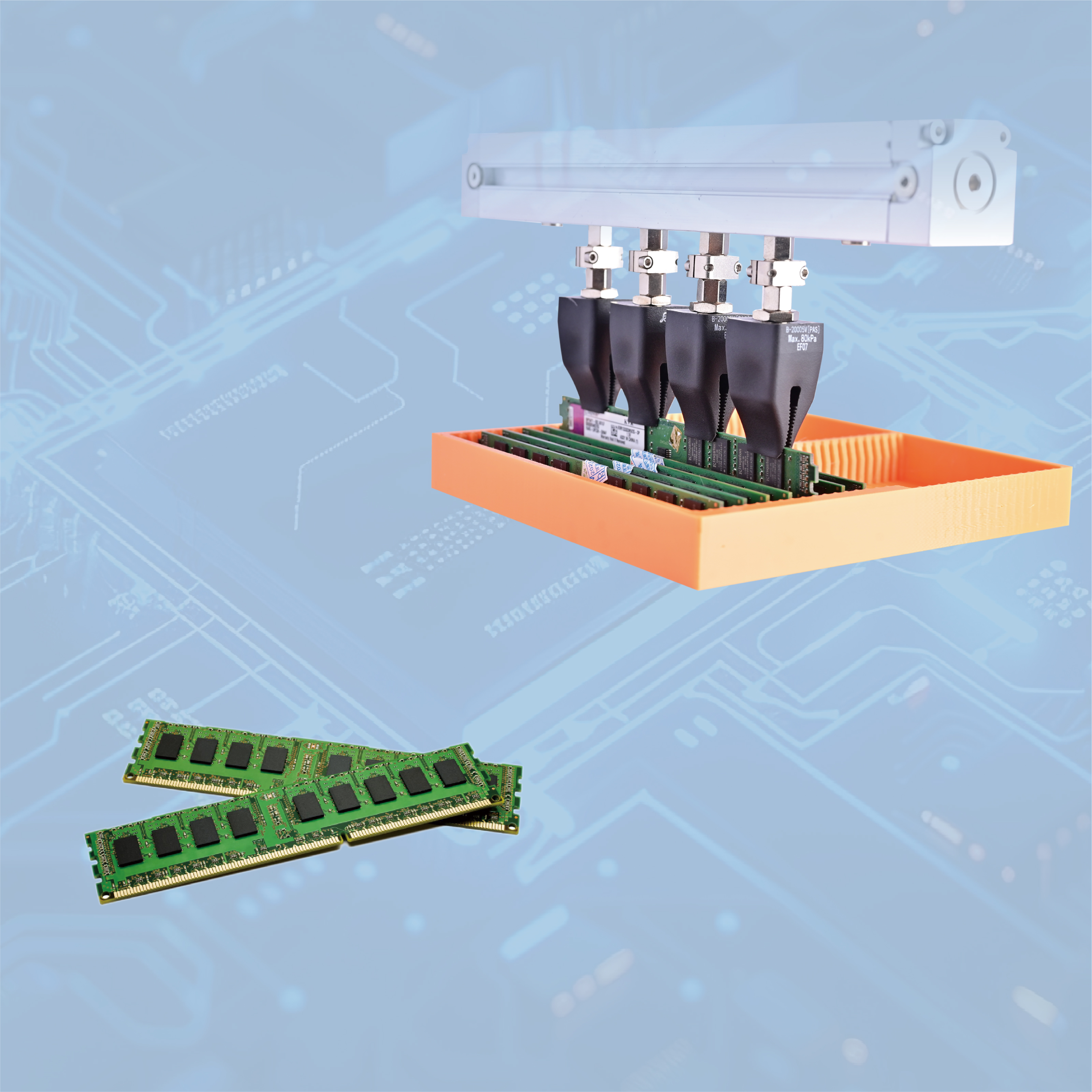 内存条料盘中竖直摆放,且排布比较密,留给夹爪的空间有限,为保证效率需要多片同步夹;