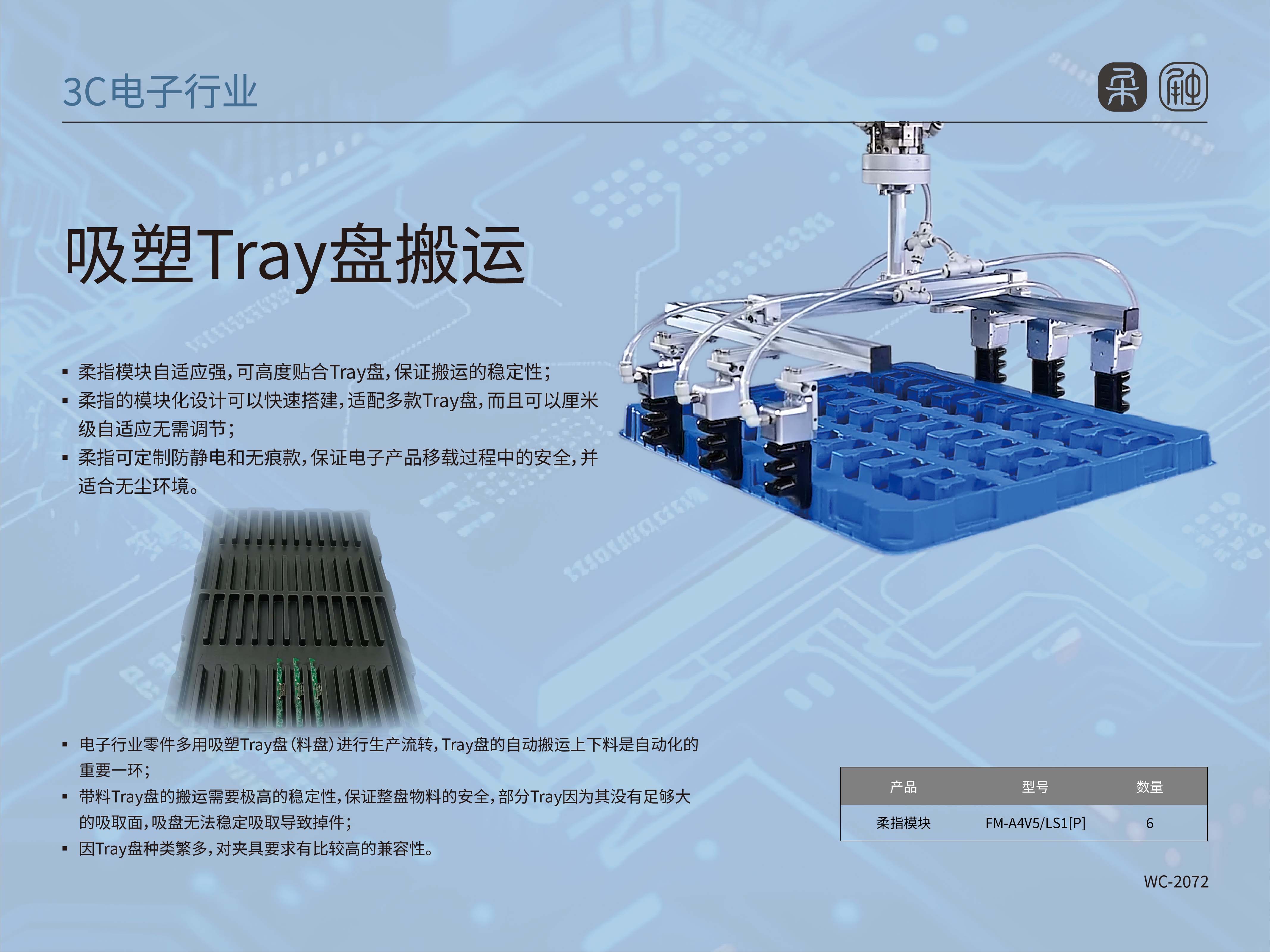 柔指模块自适应强,可高度贴合Tray盘,保证搬运的稳定性;